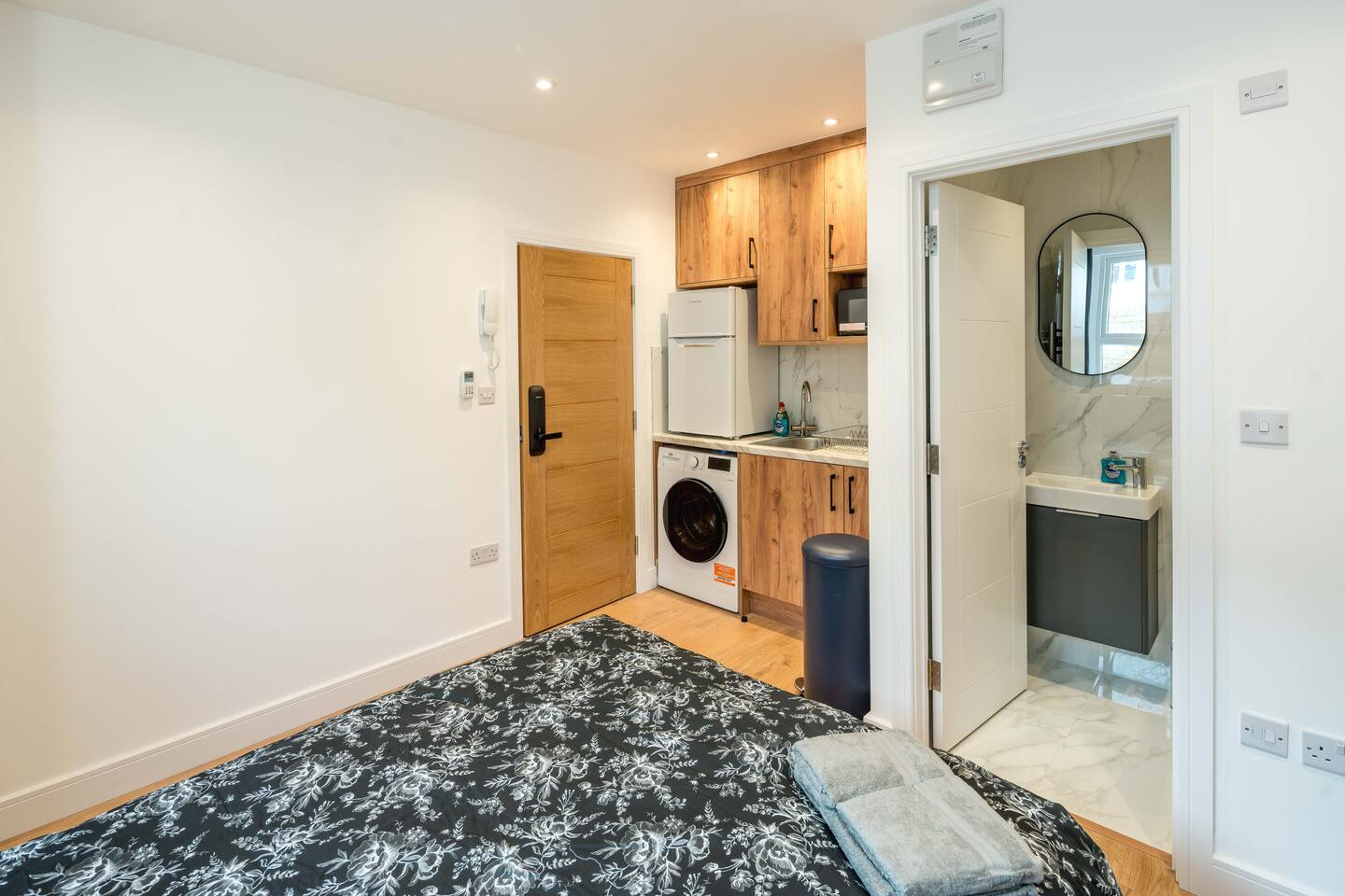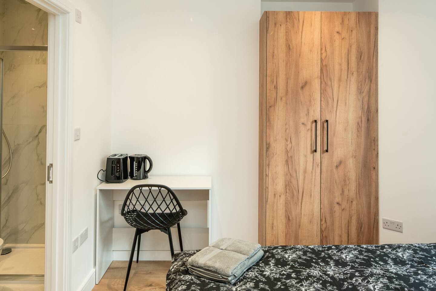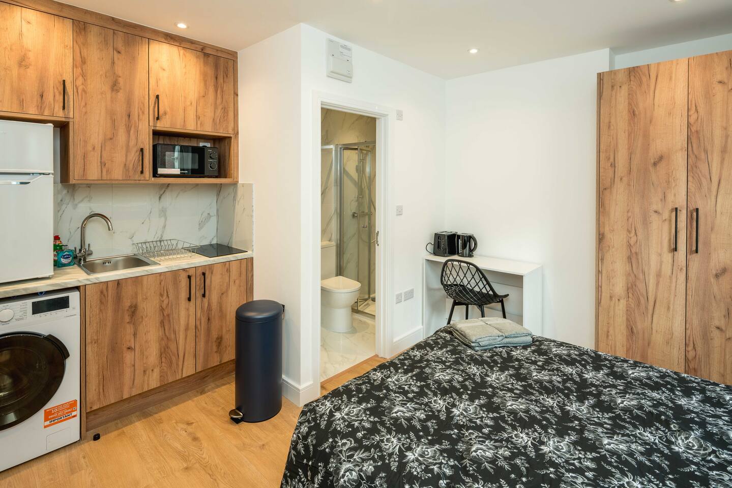 This double-bed studio is located on the lower ground floor with 8 steps to climb and comes with: One double bed Work desk Kitchen Fully private en-suite bathroom Fresh linen Fresh towels Hair dryer Washing machine Dryer machine Microwave Kettle Toaster Cooker Dinnerware Cookware