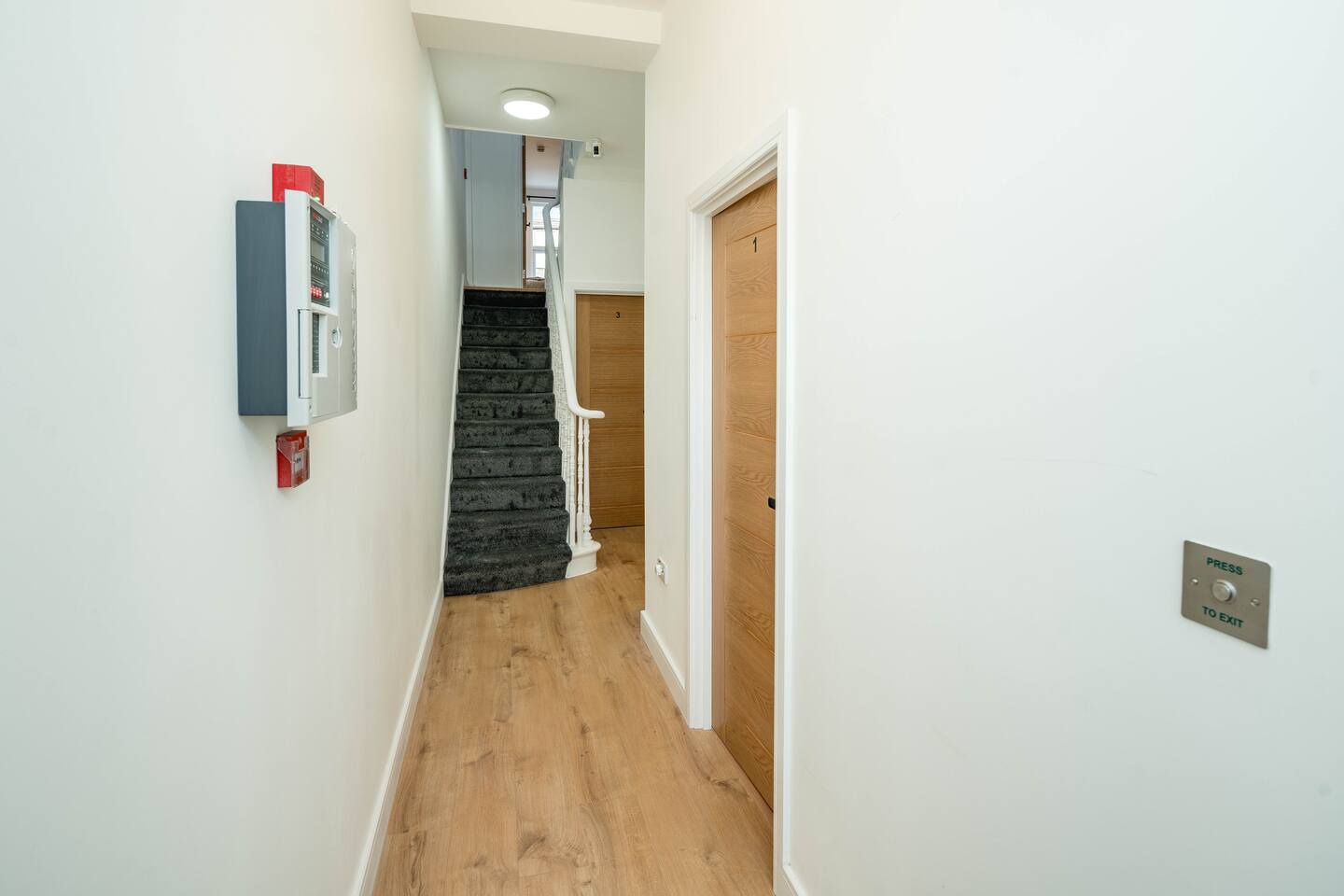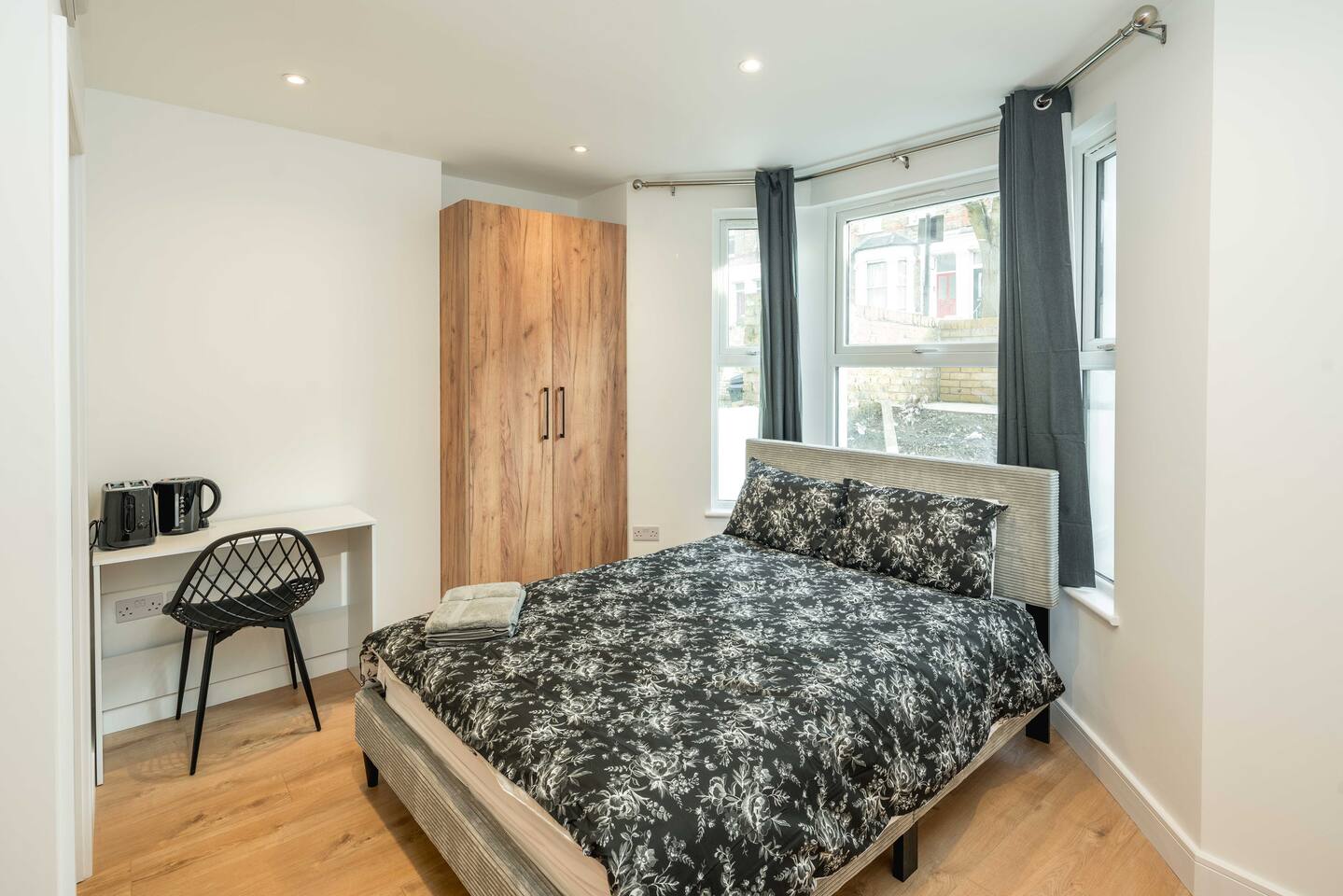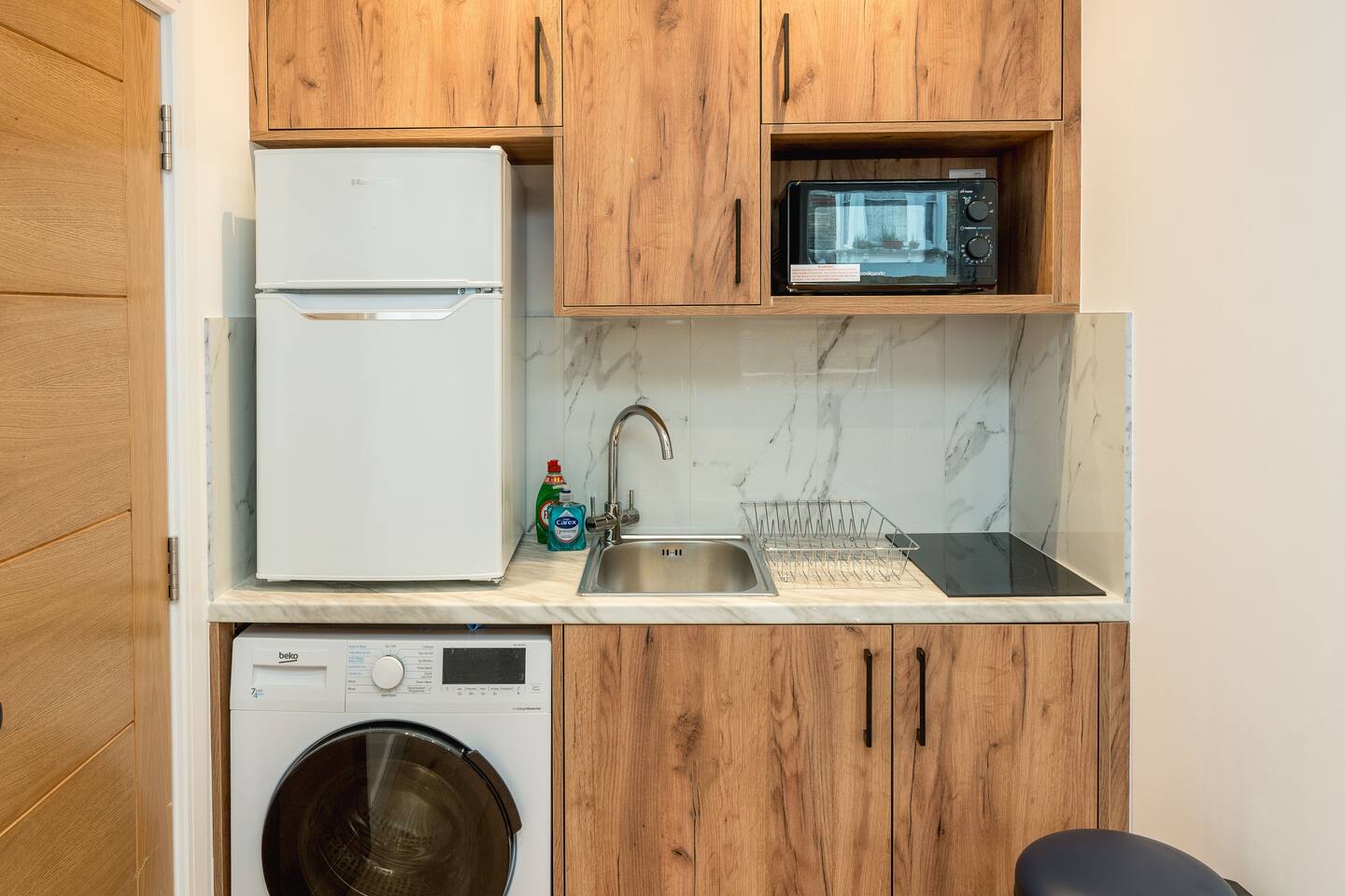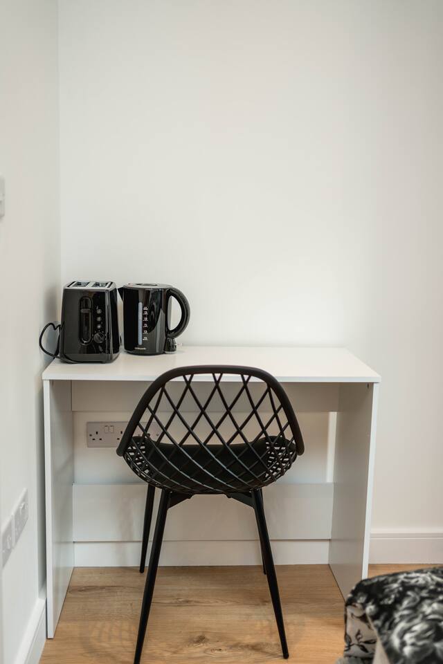 This double-bed studio is located on the lower ground floor with 8 steps to climb and comes with: One double bed Work desk Kitchen Fully private en-suite bathroom Fresh linen Fresh towels Hair dryer Washing machine Dryer machine Microwave Kettle Toaster Cooker Dinnerware Cookware